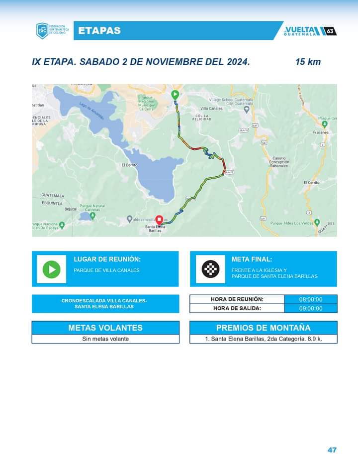 La novena etapa se disputará este sábado 02 de noviembre, iniciando por primera vez en el parque de Villa Canales, los pedalistas harán una cronoescalada de 15 kilómetros hacia Santa Elena Barillas. Únicamente habrá un premio de montaña.