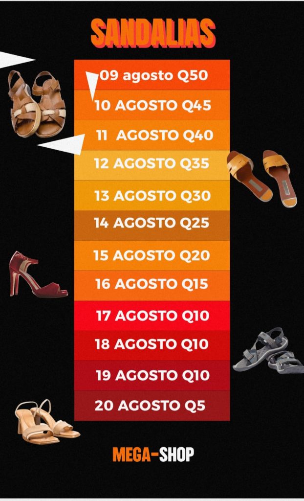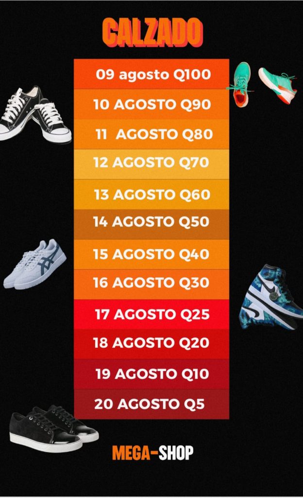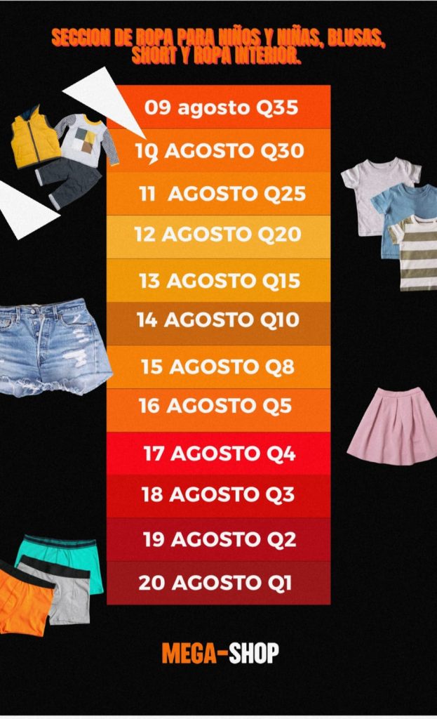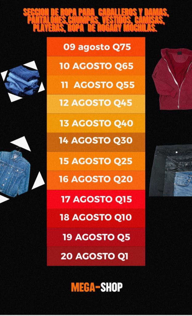 ✔️Todos los días tendremos más del 10% de descuento en ropa y calzado. Cada día disminuirán los precios de manera progresiva desde el 09 de agosto hasta el 20 del mismo mes.