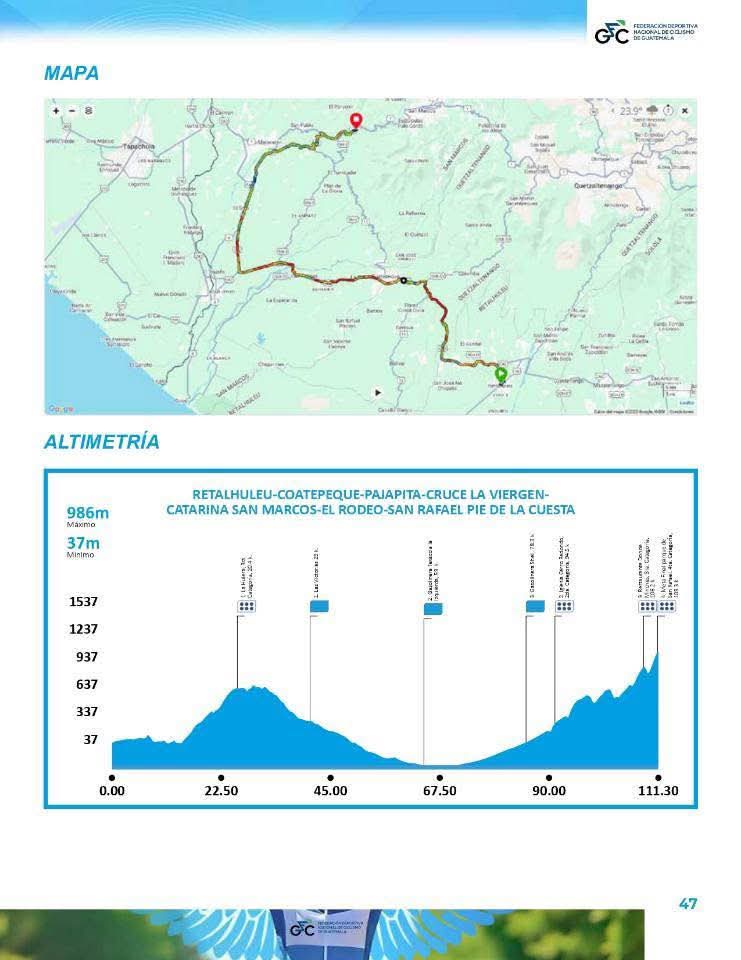Etapa V: Fecha: Martes 28 de octubre. Recorrido: Retalhuleu – Coatepeque – Pajapita – Cruce La Virgen – Catarina San Marcos – El Rodeo – San Rafael Pie de la Cuesta. Distancia: 111.30 kms.