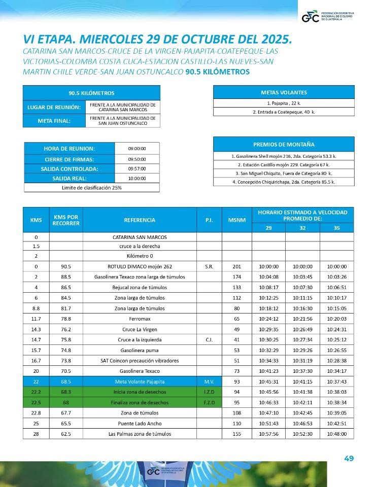 La competencia continuará este miércoles con la sexta etapa la cual dará inicio frente a la Municipalidad de Catarina San Marcos. Habrá cuatro premios de montaña y dos metas volantes.